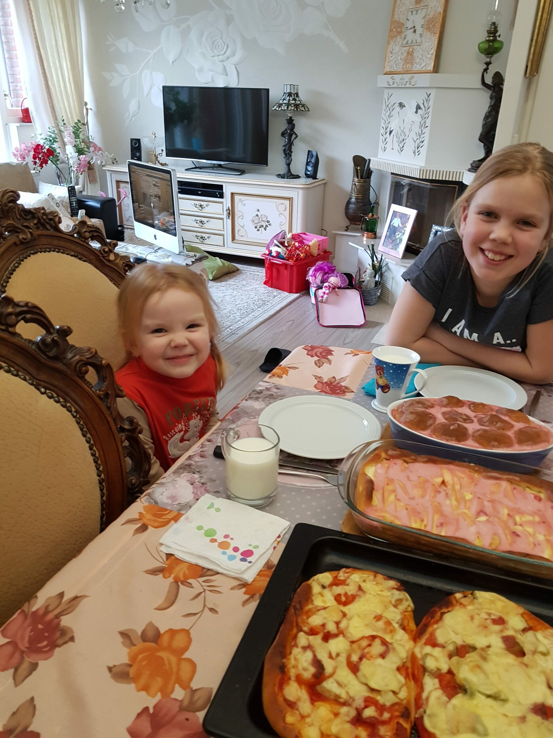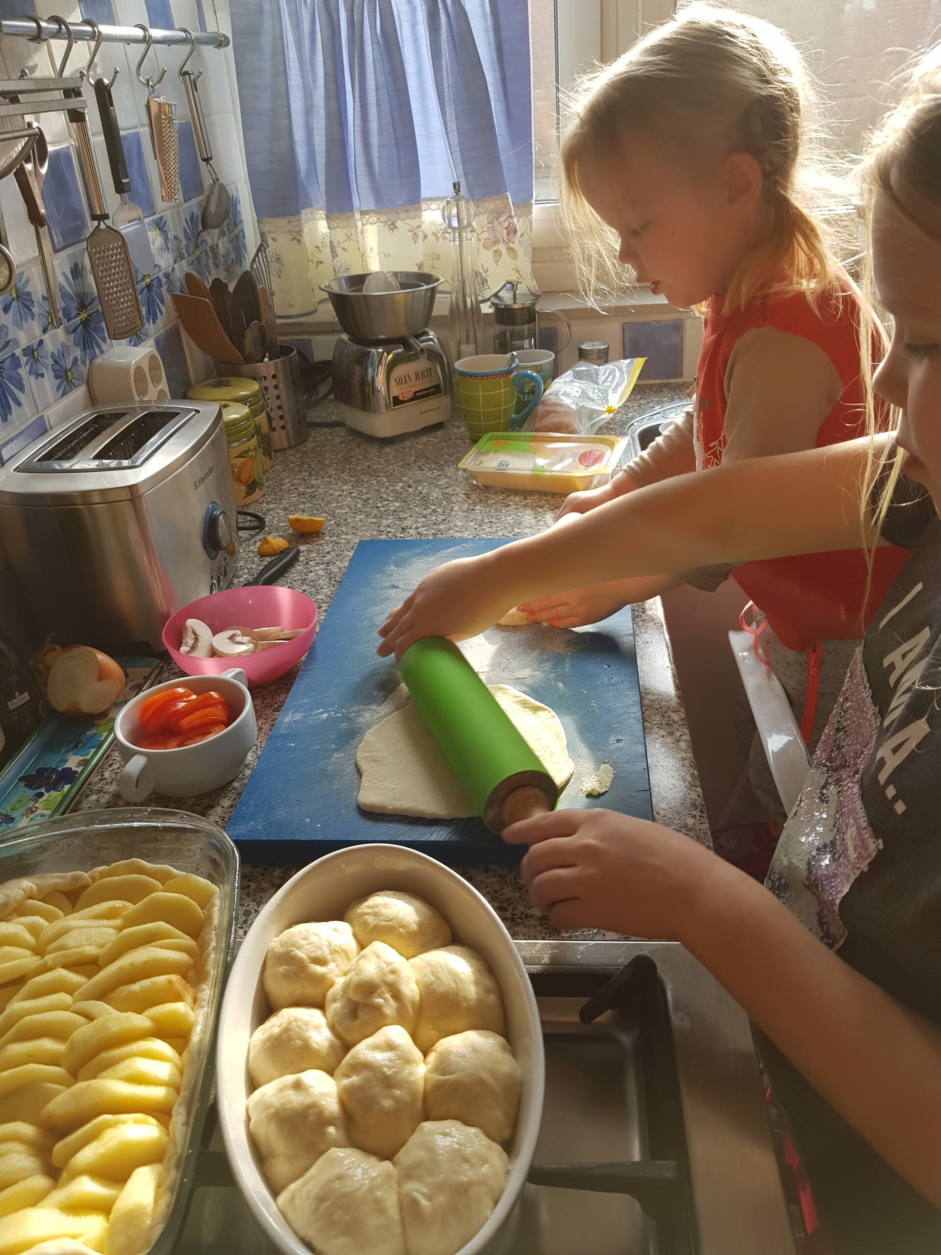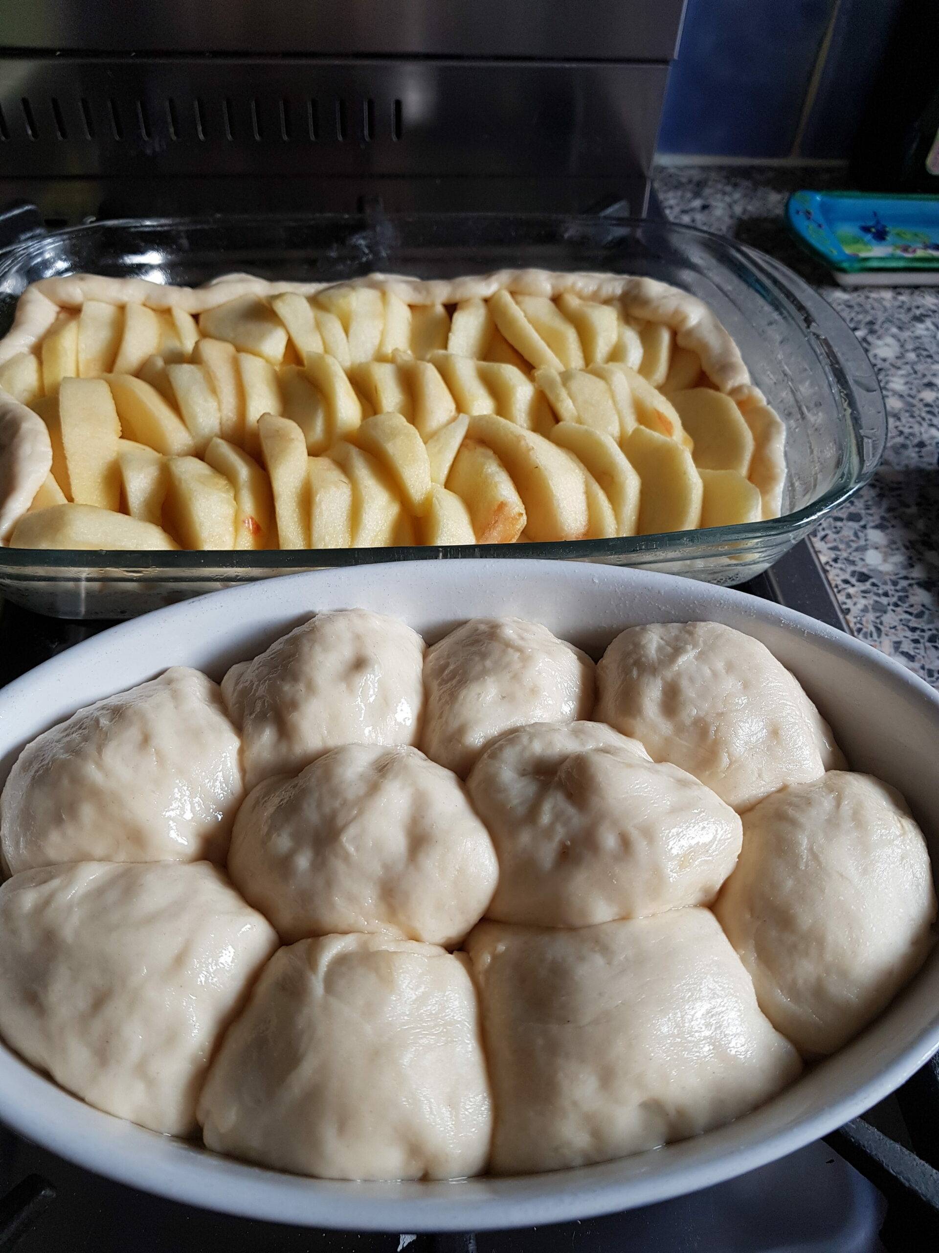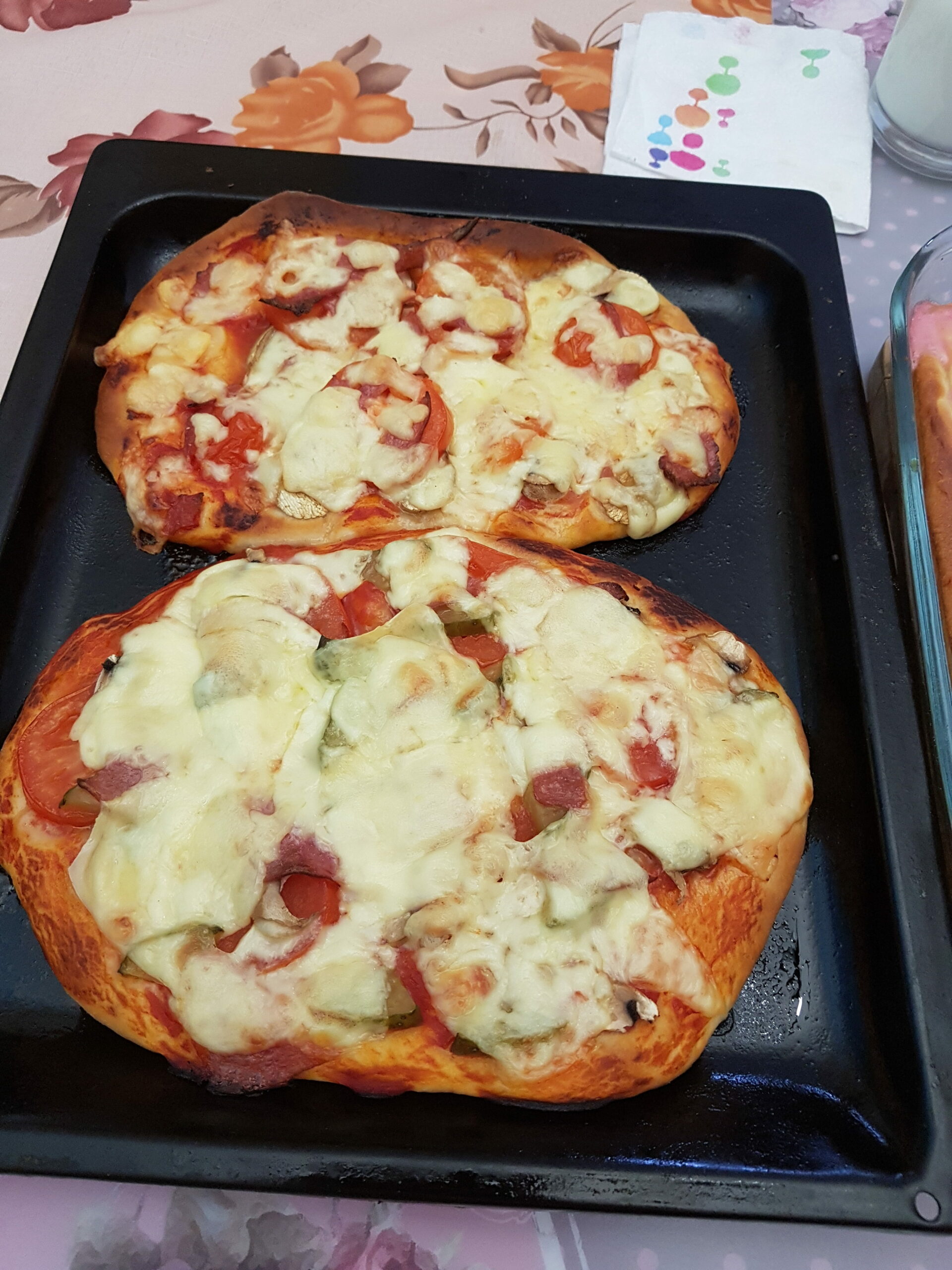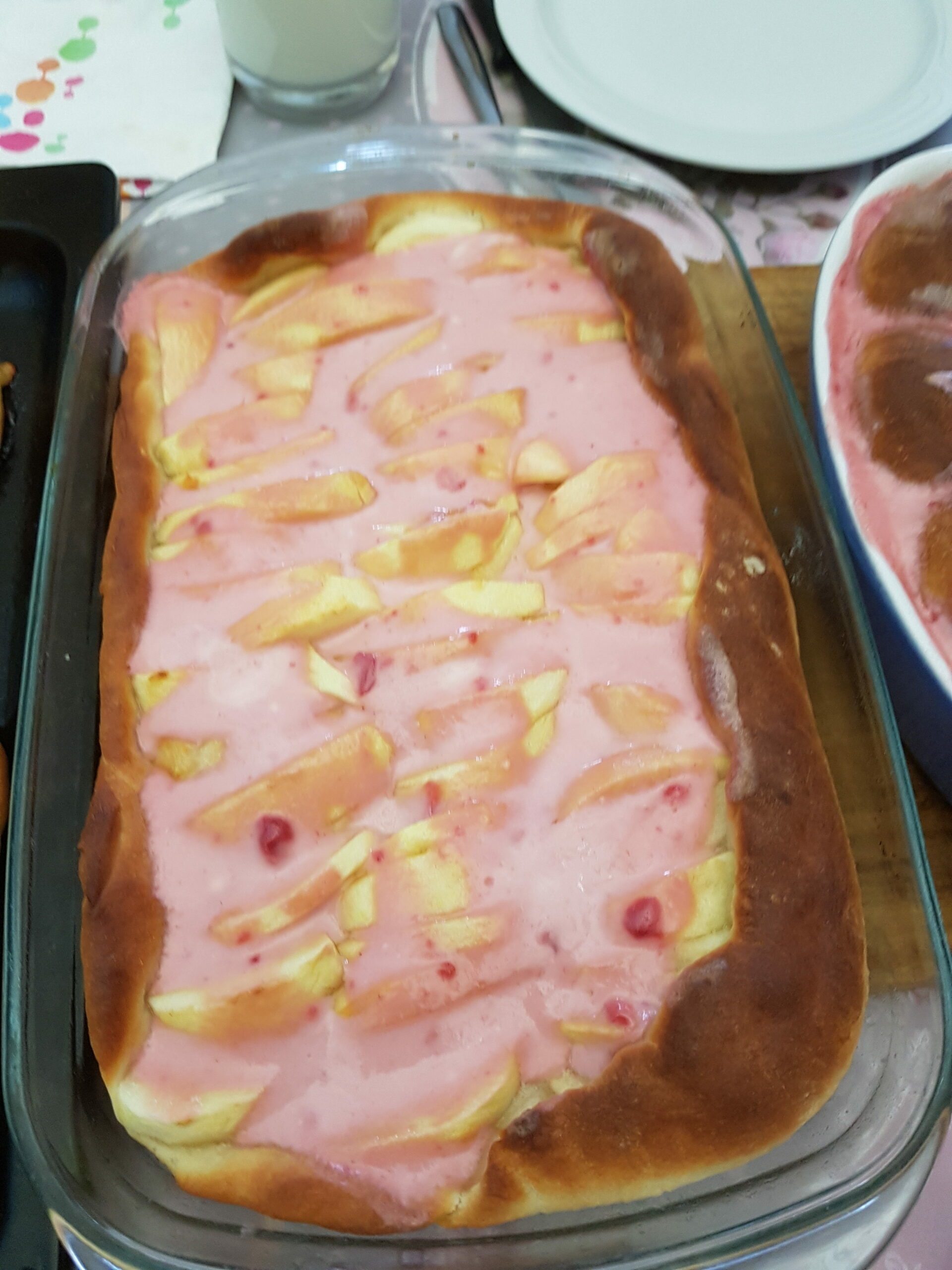 Donuts with caramel, pizza, apple pie.