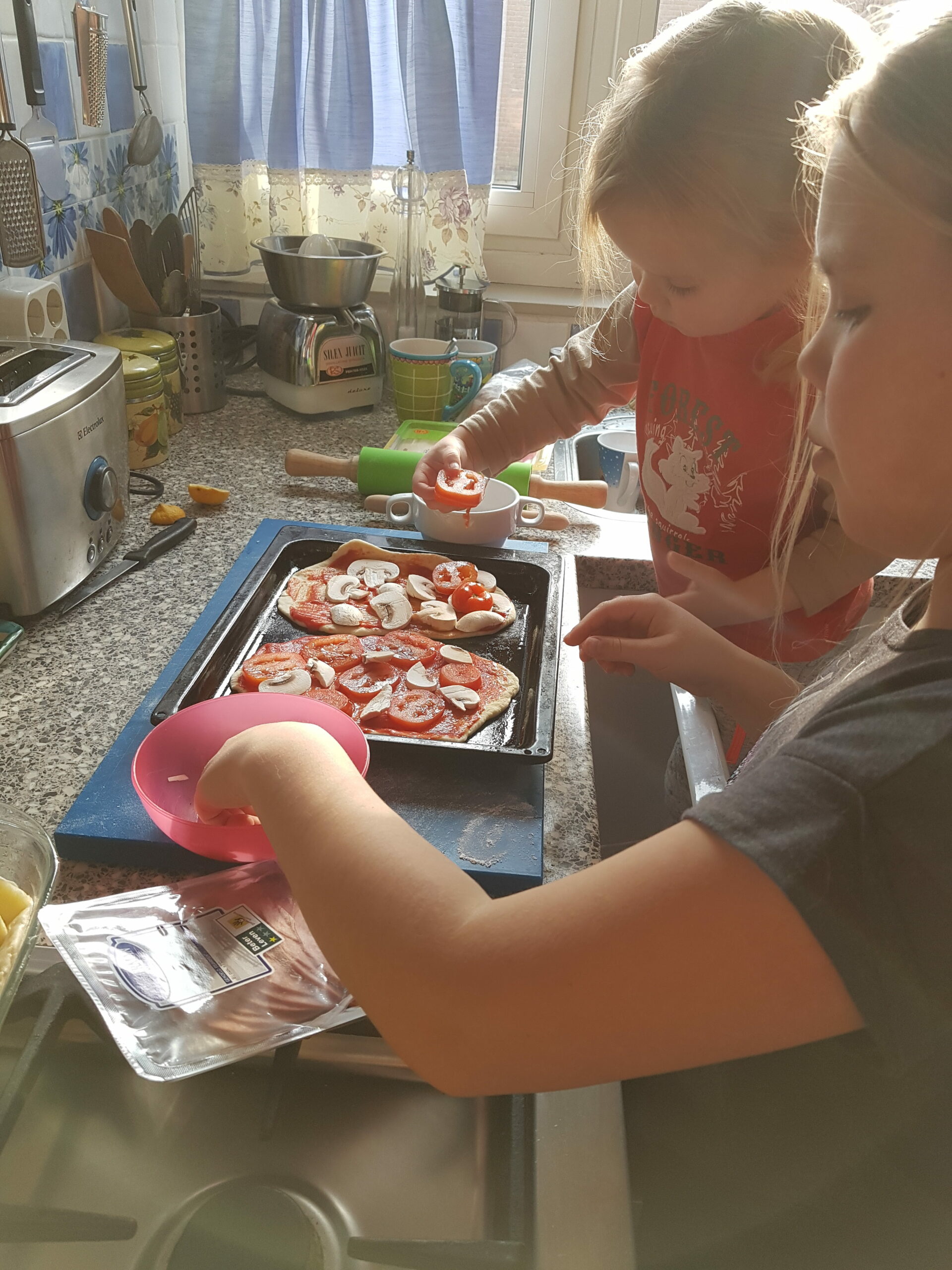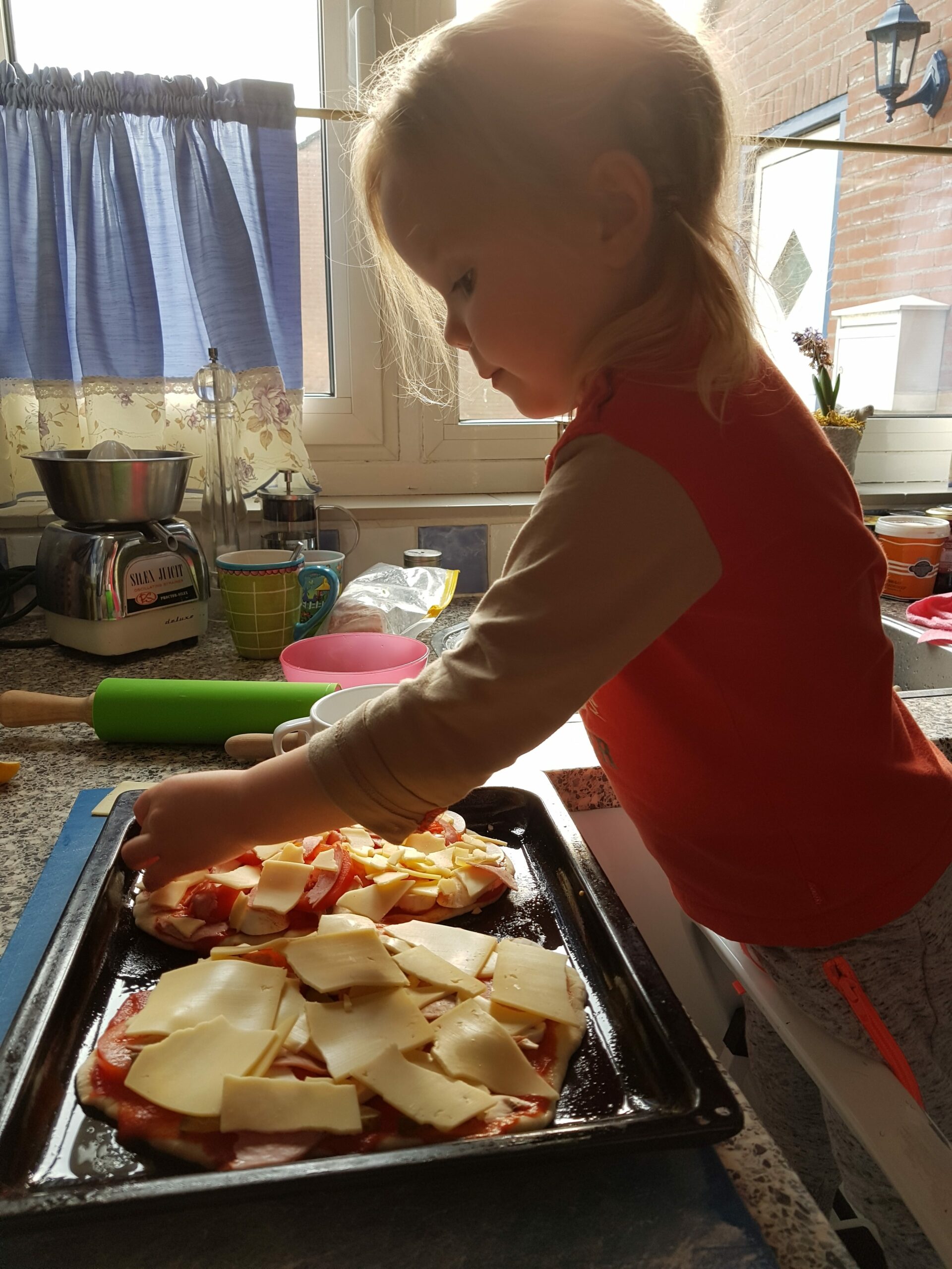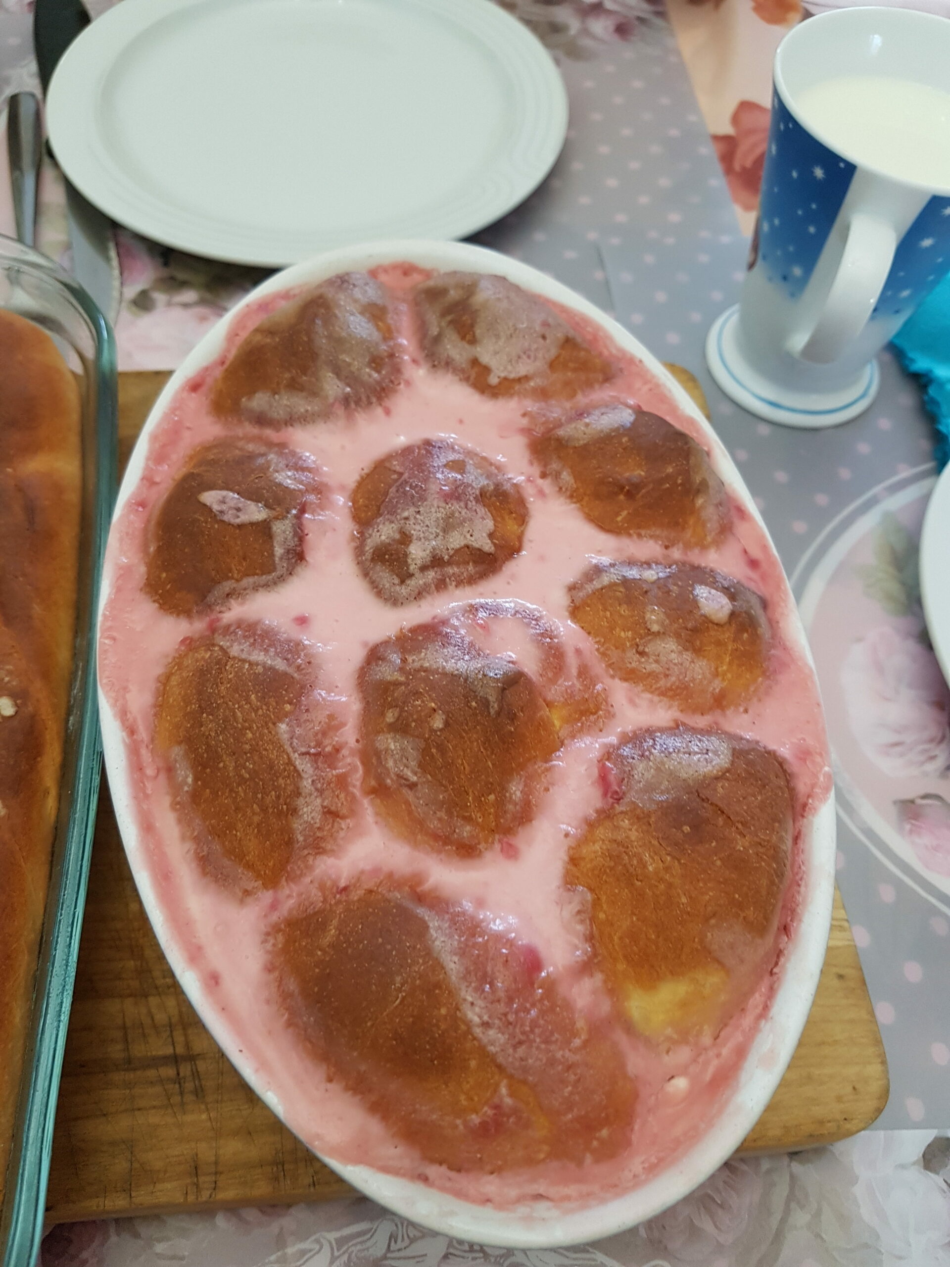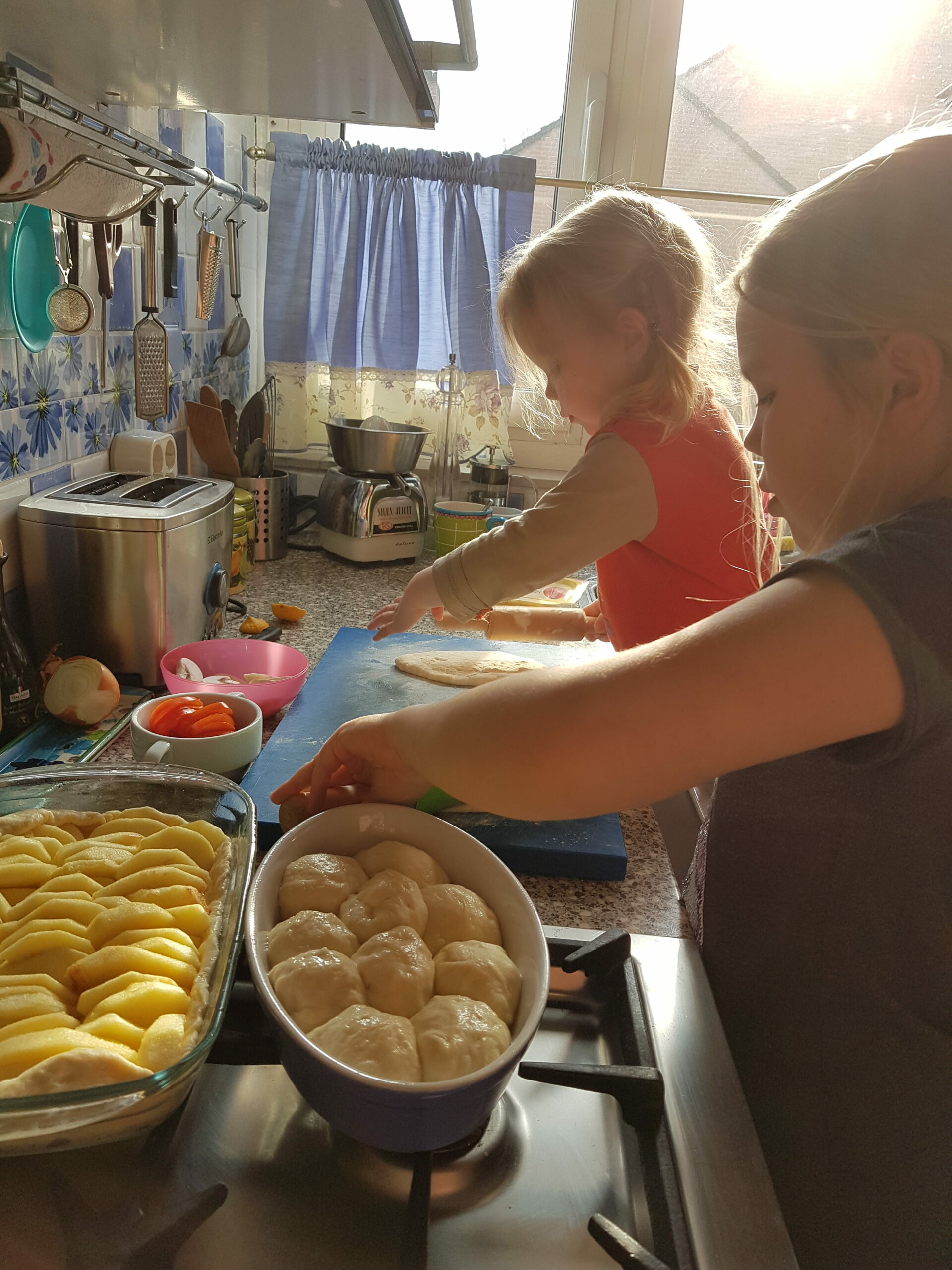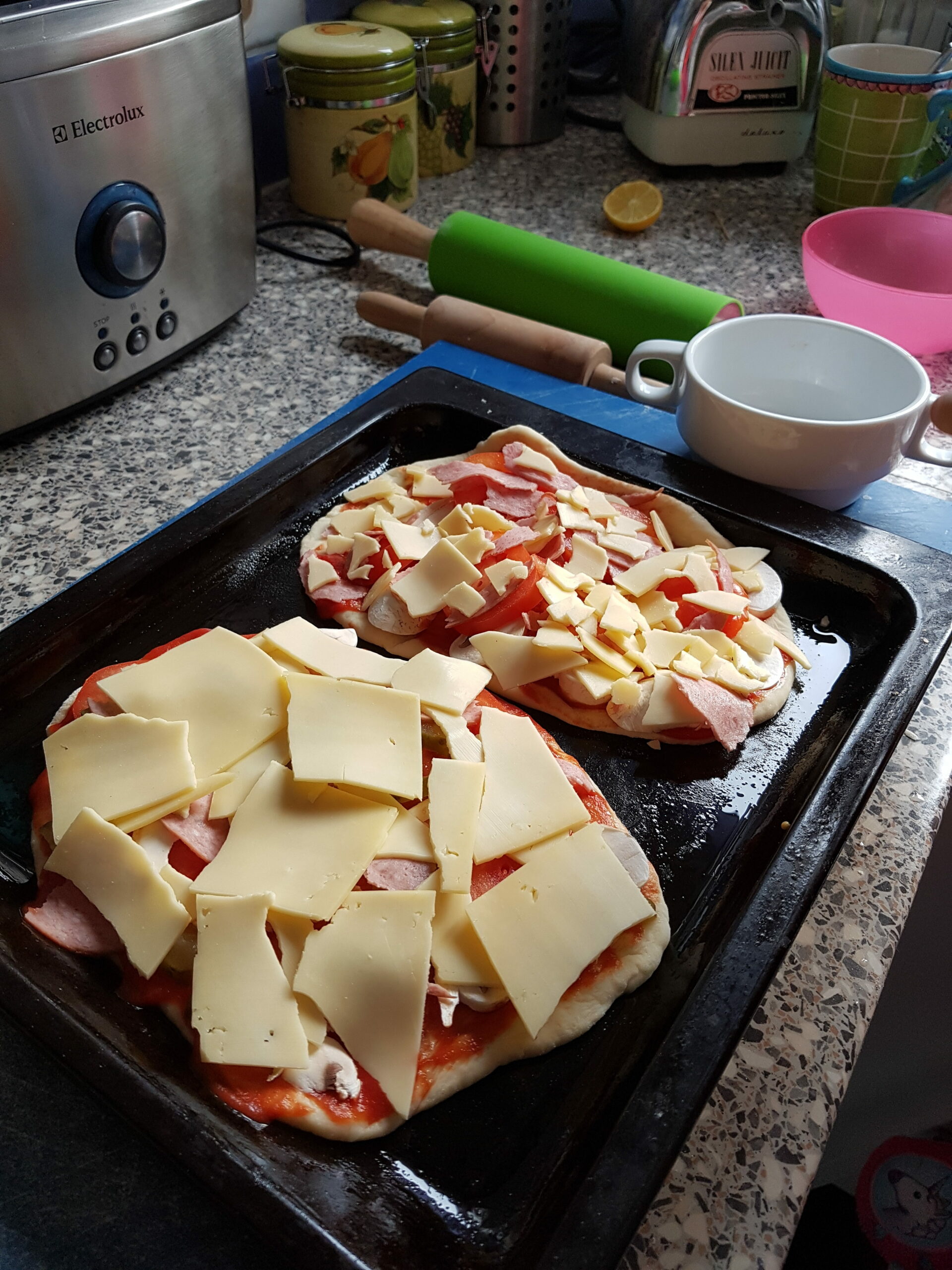 Donuts with caramel, pizza, apple pie.