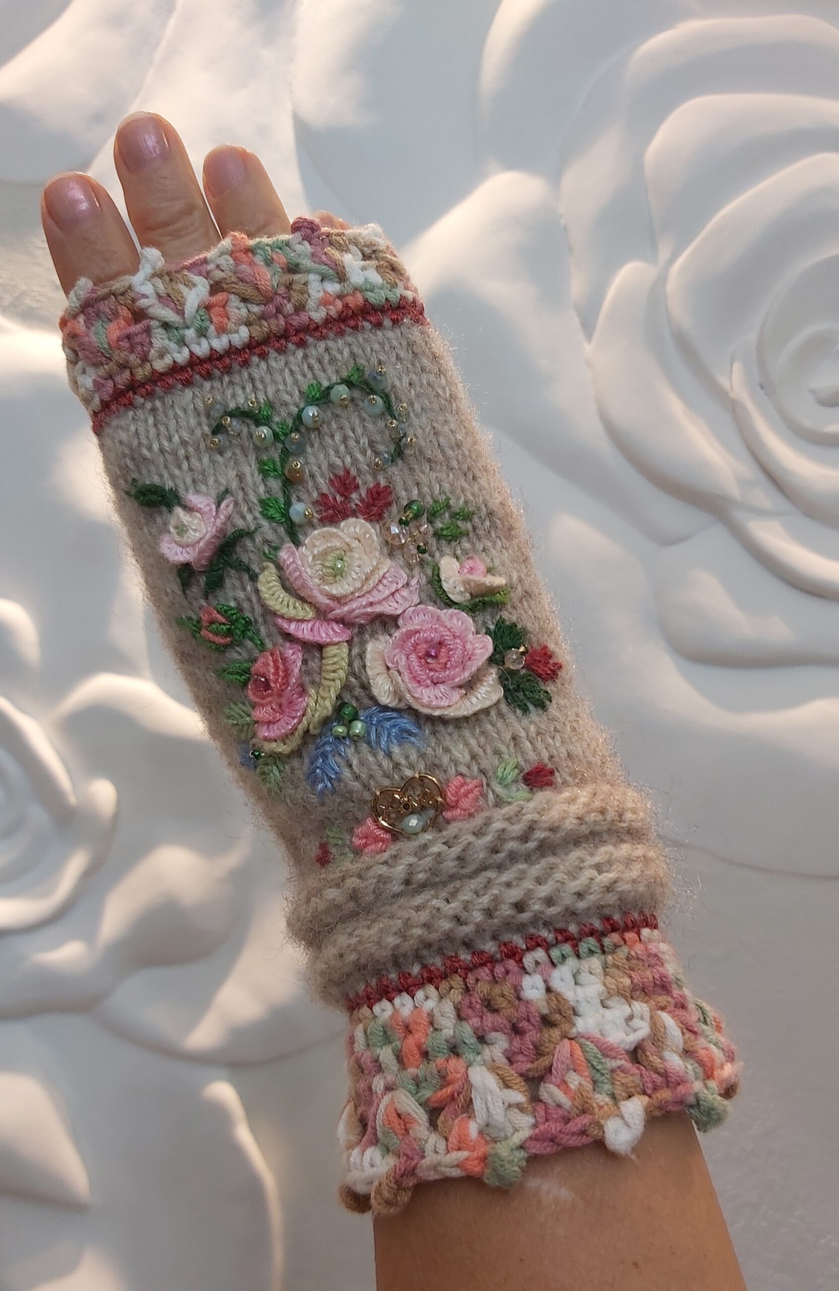 Light beige Mitts with Embroidery Roses. Original model, exlusive mitts.