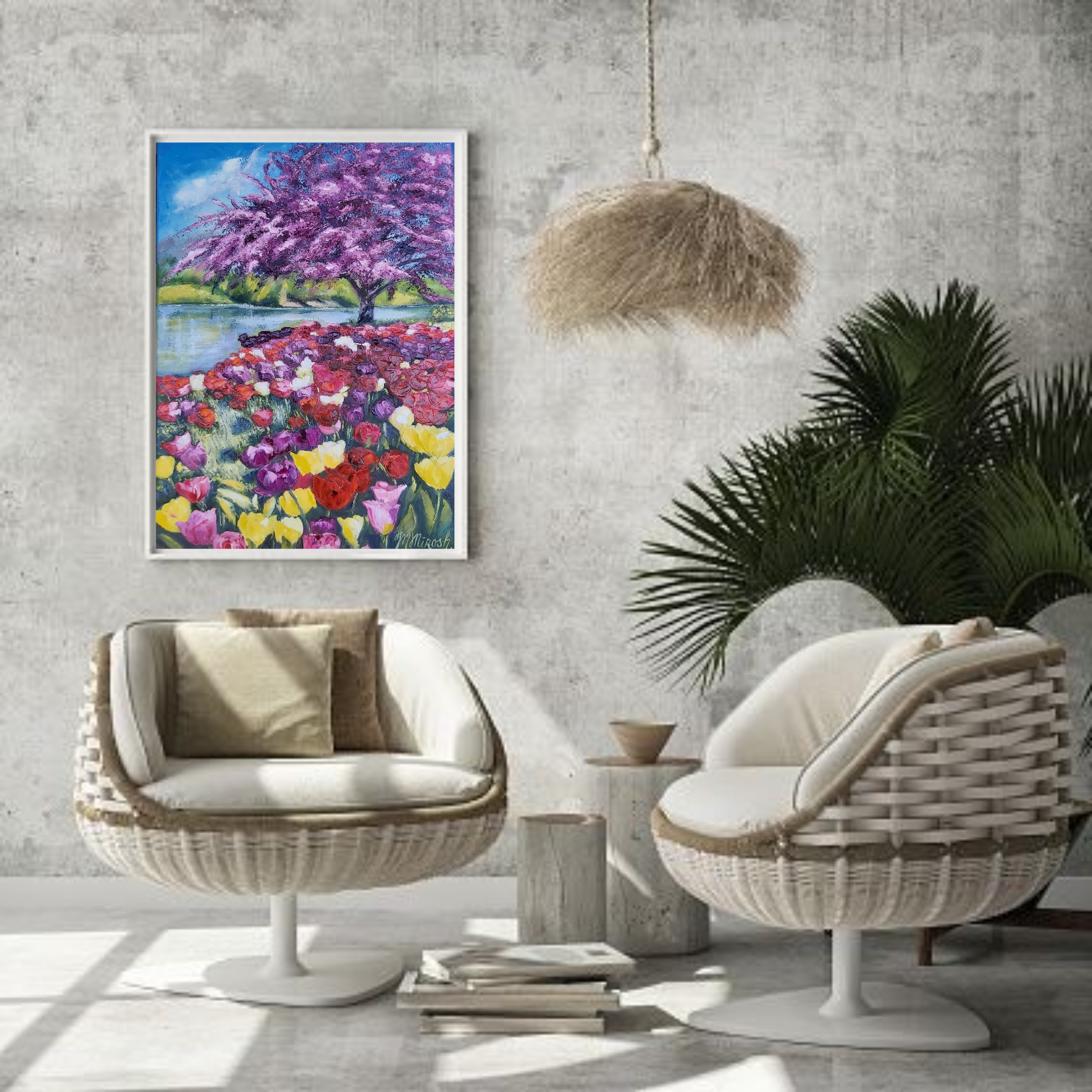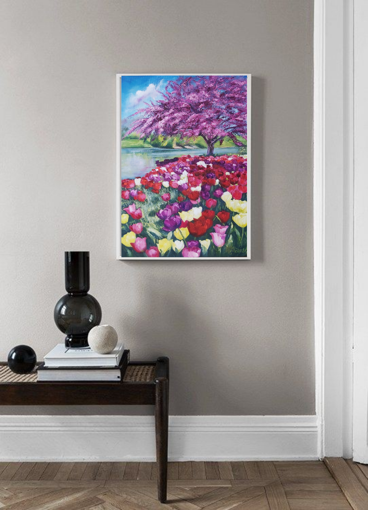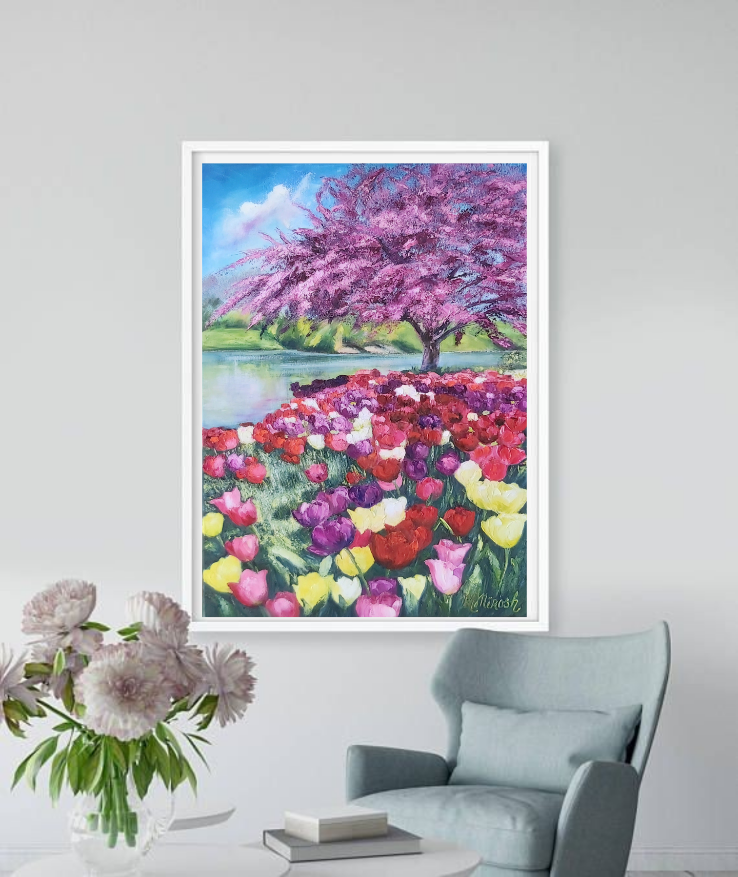 Oil painting Landscape with Tulips on canvas.