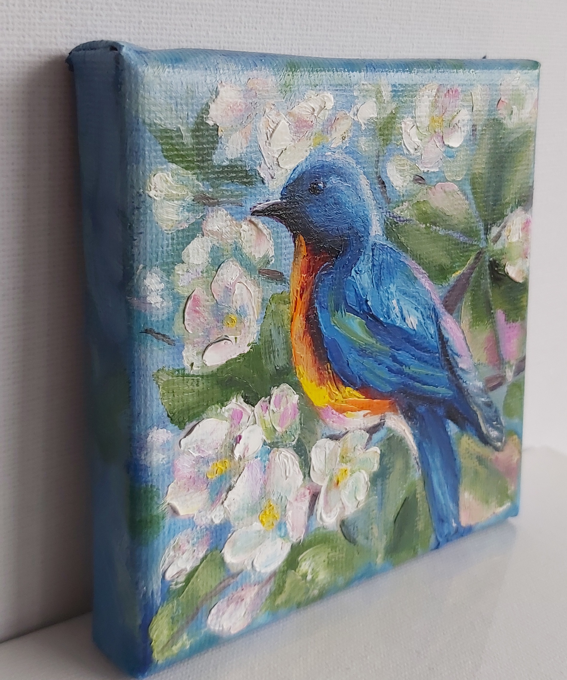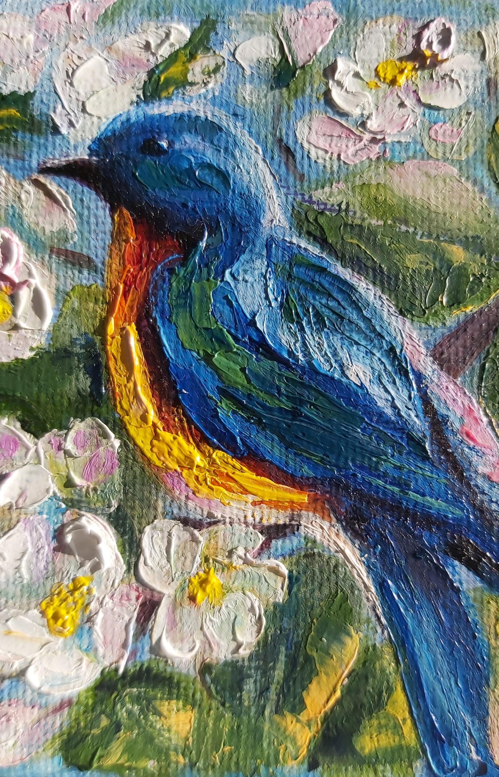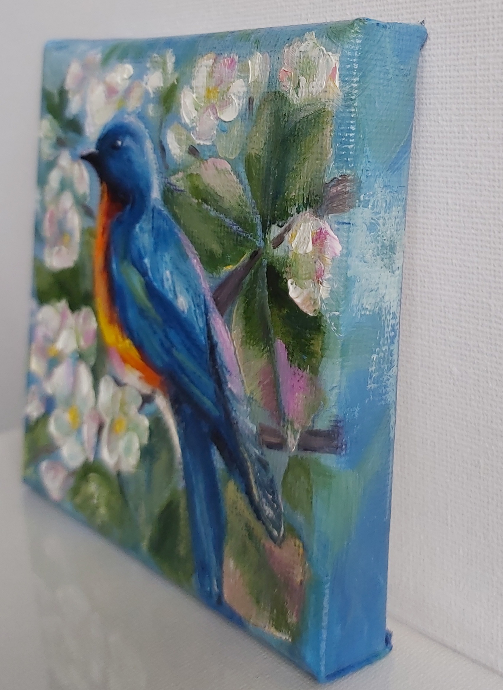 Oil painting Spring . Small oil is with a Bird .